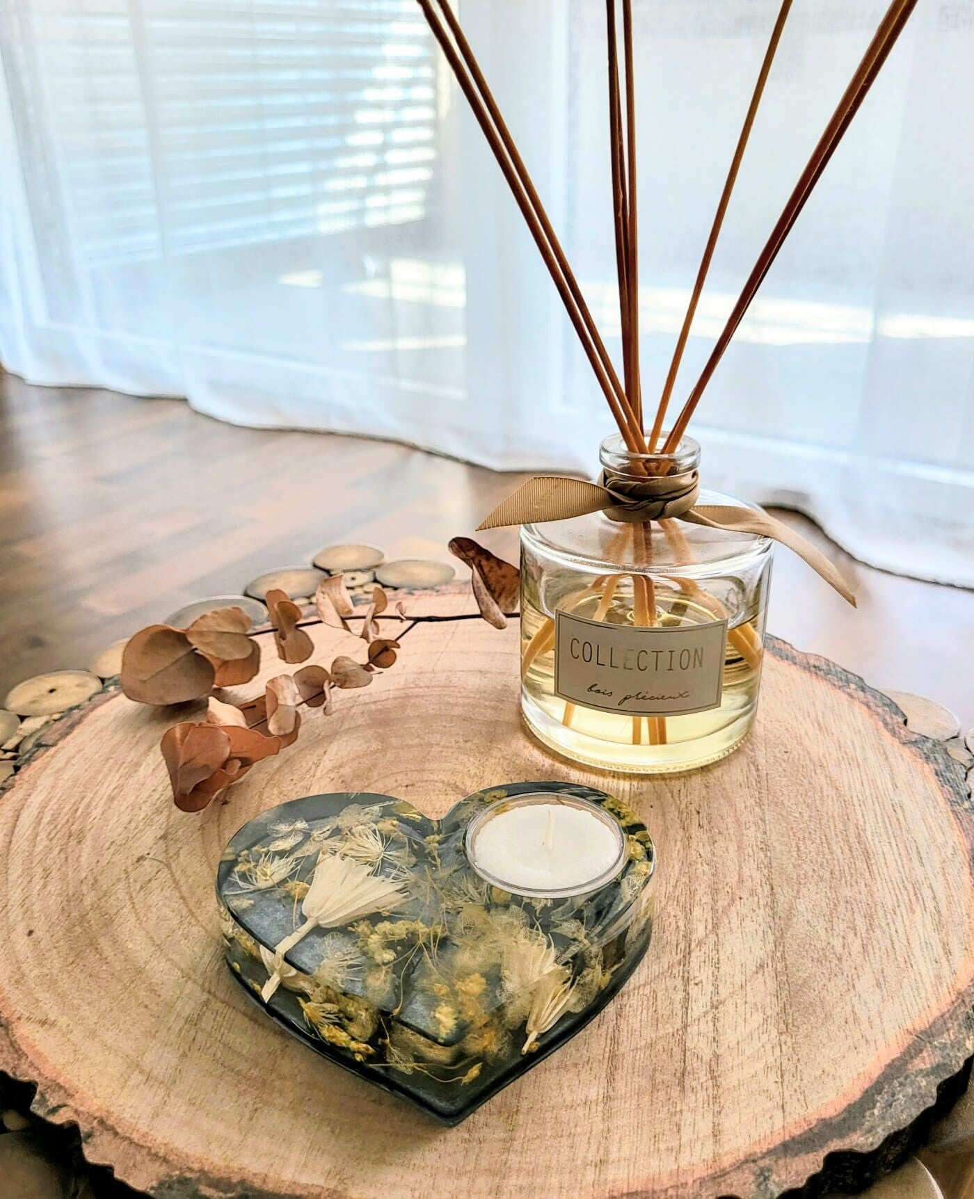 • Kerzen können auf dem Tablett stehen, am besten in Glas-, Metall- oder Aluminiumbehältern, damit die direkte Hitze nicht auf das Harz wirkt. Offene Flammen oder stark erhitzende Kerzen ohne Schutz können die Oberfläche beeinträchtigen.